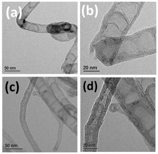 (a,b) HRTEM images of NCNT700 and (c,d) HRTEM images of NCNT800.