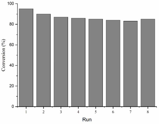 The stability of N-CNTs 700 was evaluated in the veratryl alcohol oxidation. The catalyst was found to exhibit almost the same conversion and selectivity after eight cycles, and the results are summarized in Figure 3.