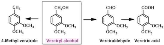 Oxidation of veratryl alcohol to different products (the reaction also involved the formation of 4-methyl veratrole).