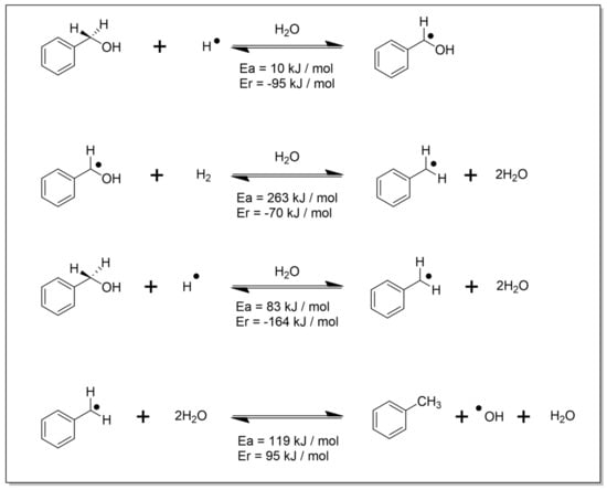 The formation of toluene under oxidative conditions is quite unique for base-free carbo-catalysts; therefore, the mechanism of veratryl alcohol oxidation was investigated using DFT calculations. The analysis was performed by choosing benzyl alcohol (BA) as a model compound in comparison to veratryl alcohol due to its facilitation of easily running the calculations, and the results are shown in Scheme 2. The conversion of BA into benzaldehyde is a facile process and easily proceeds in a forward direction. The formation of toluene in this oxidation reaction may be explained by the self-oxidation and reduction reaction of BA [31]. While investigating toluene formation via the disproportionation reaction, the barriers were found to be very high, and this pathway did not appear to be feasible. Therefore, it appears that there is no direct pathway from BA to toluene. Hence, the second option for toluene formation was considered. It was observed that toluene was formed through the formation of intermediate PhCH2*, which involves water formation. The formation of H2 is kinetically preferable (although another pathway leads directly to PhCH2* + 2 H2O). The results are shown in Scheme 2.