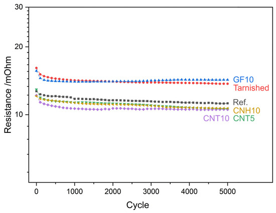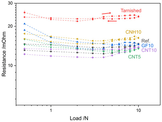- Alderete, B.; Suarez, S.; Tejeda, D.B.; Mücklich, F. Fretting and Electrical Contact Resistance Characteristics of Carbon Nanoparticle-Coated Cu Electrical Contacts. In Proceedings of the 2022 IEEE 67th Holm Conference on Electrical Contacts (HLM), Tampa, FL, USA, 23–26 October 2022; IEEE: Piscataway, NJ, USA, 2022; pp. 1–8. [Google Scholar]