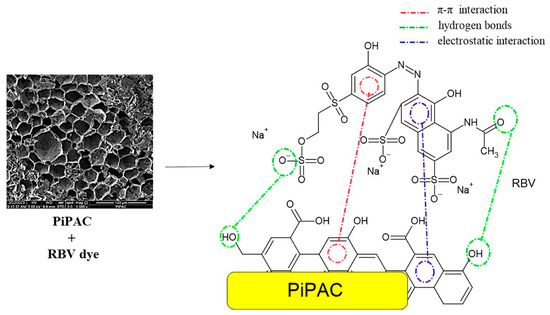 - π–π interactions between the π–electrons of carbonaceous PiPAC and in the aromatic ring of the dye [50].