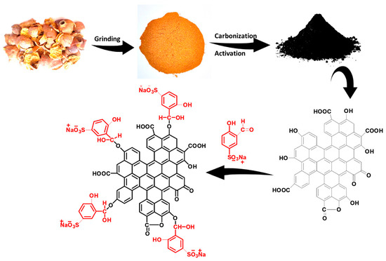 Surface modification of activated carbon may also increase its adsorption capability for the removal of pollutants. This could be accomplished by chemically modifying its surface or by introducing external compounds, thus increasing the quantity of active areas for adsorption. Thamer et al. introduced AC derived from pomegranate peel (PPAC), as well as modified PPAC with sulfo-units (S-PPAC) [51]. To produce PPAC, KOH was used as the activating agent along with carbonization. Figure 2 illustrates the production of PPAC and S-PPAC. The sulfonation of PPAC was achieved by dissolving 5-sulfonate-salicylaldehyde sodium salt and mixing it with PPAC, so that S-PPAC was obtained by covalent bonding. N2 isotherm and BET analysis showed that both materials had high surface areas: 1180.63 m2/g for PPAC and 740.75 m2/g for S-PPAC. As the model pollutant, crystal violet (CV) was used. The optimal pH was found to be 10, with a 100% removal for the modified derivative, maintaining a high removal even after 5 cycles. According to the isotherm data, the Freundlich model was the most suitable for explaining adsorption, whereas the Elovich model was the most appropriate for characterizing adsorption kinetics. The adsorption mechanism suggested that electrostatic attraction was the key driving factor. However, the effect of pH evaluation showed that pore-filling, hydrogen bonding, and π–π interactions were critical in the mechanism of adsorption.