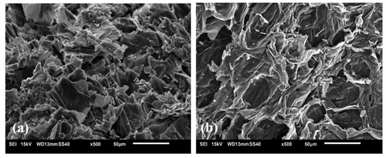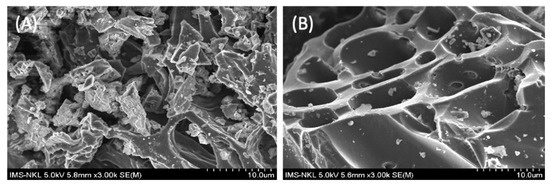 SEM images for (a) raw material; (b) activated carbon at magnification of ×500 [57] (reprinted with permission).