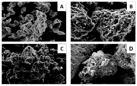 SEM images of (A) AC-OP, (B) OP-TiO2, (C) AC-DS, and (D) DS-TiO2 [62] (reprinted with permission).