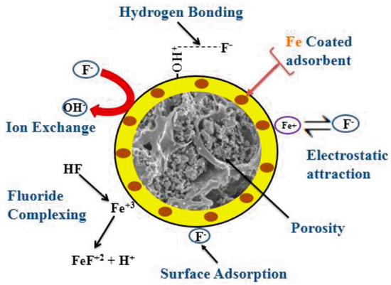 Sahu et al. examined the removal of fluoride from an aqueous solution by both batch and column experiments with activated carbon derived from pea peels, activated by FeCl3 and pyrolysis [60]. The efficiency of MPPAC-500 was evaluated by the study of the effects of temperature, kinetics, and pH, and the material was characterized. In batch research, 5 mg/L starting fluoride concentration at a pH = 7, 4 g/L dosage and 420 min of exposure resulted in 99% fluoride elimination. The Freundlich isotherm model was preferred in the adsorption investigation, revealing a mono-layer adsorption process. The pseudo-second-order kinetic model accurately characterized fluoride accumulation, showing that chemisorption was preferred. Thermodynamic characteristics revealed that the adsorption reaction was endothermic and spontaneous. A possible adsorption mechanism is shown in Figure 7 below.