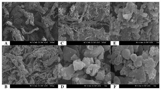 Magesh et al. used jackfruit peels (JFP) to synthesize AC and eliminate ciprofloxacin from an aqueous environment [53]. The JFP were made into a pair of adsorbent materials. The first was made by treating it with H3PO4 and converting it into activated carbon, and the second was prepared by grafting JFP activated carbon with ZnO (ZJFP) via a sonication method. The modified AC had a fascinating removal of 99.8% at optimal conditions, which included pH = 6 at a dosage of 0.3 g/L. The kinetic data prove that the adsorption procedure consisted of chemisorption, and that ZJFP better fit the Freundlich isotherm model, indicating double-layer adsorption. Figure 3 presents the SEM images before and after adsorption.