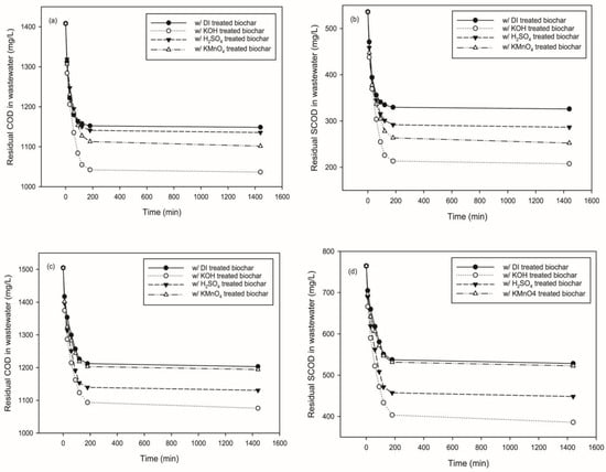 | Wastewater | Contaminant Type | Parameters | DI Water Biochar | KOH Biochar | H2SO4 Biochar | KMnO4 Biochar |