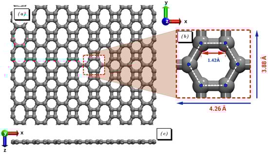 (a) Schematic representation of the BPN sheet and its unit cell (a), (b) zoomed-in region of the structure containing the unit cell with lengths of the unit vectors, (c) and side view of the structure.