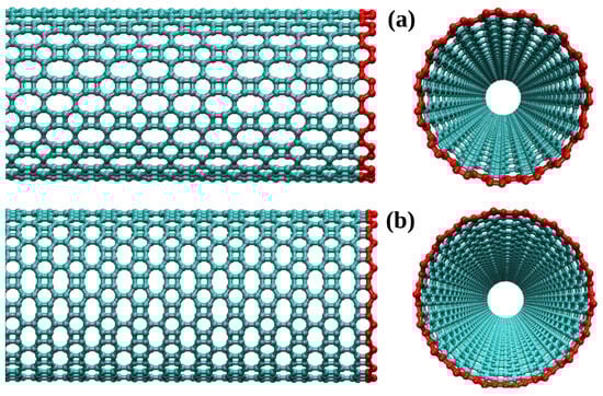 We numerically integrated the equations of motion using the velocity Verlet algorithm [57] with a time step of 0.1 fs. A uniaxial tensile deformation was applied along the length of the nanotubes (axis z), with an engineering strain rate of . Before initiating the stretching process of the nanostructures, they were equilibrated in an NPT ensemble at a constant temperature of 300 K, using a Nosé–Hoover thermostat [58] for 200 ps, to prevent the occurrence of residual stresses from system modeling. Before this, all systems were optimized at 0 K. The maximum deformation applied to the structures was 50%, and the values of von Mises (VM) stress [59] were calculated for each atom k through the expression
