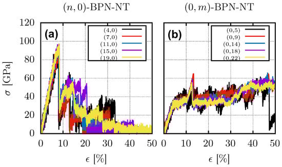 In the same perspective, a similar behavior is presented for the systems (0,5), (0,9), (0,14), (0,18), and (0,22)-BPN-NT in Figure 3b, with curves in black, red, blue, purple, and yellow, respectively. As in the armchair case, here, the -BPN nanotubes (zigzags) show a behavior not significantly affected by the diameter but with a change from elastic to plastic regimes occurring at considerably smaller deformations, around 5%. The system appears more malleable in this type of edge, with significantly lower maximum stress than the armchair case. One can note that the US of the systems in this chirality revolves around 60 GPa (see Table 2), while the armchair systems are close to 100 GPa.