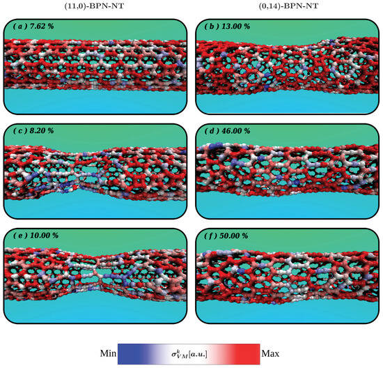For a more comprehensive discussion on the dynamics of BPN-NT under tensile loading, we illustrate in Figure 4 a sequence of representative MD snapshots for uniaxial deformation applied along the longitudinal axis of (11,0)-BPN-NTs (panels (a), (c), and (e)) and (0,14)-BPN-NTs (panels (b), (d), and (f)), displaying the von Mises stress values () [33,58]. The values provide relevant information about the local structure during fracture, making it possible to identify regions of high-stress concentration and predict where structural failures are more likely to occur.