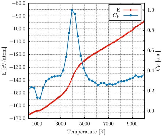 Finally, we analyze the thermal stability of BPN-NT. The system temperature and total energy as a function of time are standard output quantities provided by LAMMPS. Using a post-processing code, we calculate the derivative of total energy concerning the temperature of normalized data, thus obtaining the . We conducted simulations of gradual heating (melting process) in a temperature range from 300 to 10,000 K over 200 ps. Figure 5 illustrates the relationship between total energy (represented in red) and heat capacity (, represented in cyan), which in this study was obtained by the energy variation concerning temperature in a constant-volume system [60], during the temperature increase process from a canonical ensemble. This figure shows that the total energy increases almost linearly concerning temperature, with three clearly defined regimes indicated by the observed slopes: 300–1000 K, 1100–3000 K, and 5000–10,000 K.