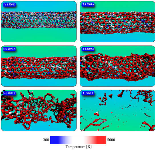 In Figure 6, we present a series of snapshots representing stages of a heating ramp simulation, with a temperature variation ranging from 300 K to 5000 K. We used a color scheme to represent the temperature per atom, with white representing 300 K and red representing 5000 K, based on the equipartition theorem. At temperatures of 1000 K and 2000 K (Figure 6b and Figure 6c, respectively), thermal fluctuations cause changes in morphology, resulting in structures similar to those presented in Figure 4b,c. Thus, we can see that temperature and deformation similarly affect structural changes in low-temperature regimes. At temperatures near 3000 K, the melting process of the structure begins (Figure 6d), and above 4000 K (Figure 6e), thermal vibrations have acquired sufficient intensity to allow the formation of only a few LACs in an amorphous structure, with no resemblance to pristine BPN-NT. Above this temperature, a complete structural transition to a gaseous phase occurs, with continuous breaking of the LACs in the system.