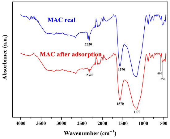 Figure 5 shows the FTIR spectra of AC and MAC samples. The most evident difference between both spectra is the decrease in the intensity of the bands between 900 and 1600 cm−1 of the MAC spectrum. This is due to the loss of most of the oxygen surface groups of the MAC sample during the treatment at 1173 K (confirmed by the reduction in the oxygen content, Table 1). The main bands observed in both samples are around 2320 cm−1 due to the asymmetric stretching vibrations of CO2 [57,58], 1570 cm−1 due to OH bending [54], and around 1170 cm−1 due to the stretching vibrations of C–OH bonds [59]. Other less intense bands are observed at lower wavelengths. The bands between 500 and 800 cm−1 are related to the C–O and metal-oxygen (Fe–O) bonds of the Fe3O4 group [55]. Bands around 550 cm−1 are associated with the M-O band (Fe–O in this case), while those around 600 cm−1 can be assigned to Fe3O4 particles on the surface [60].