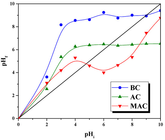 The adsorption of different solutes on the surface of the adsorbents is highly dependent on the pH of the solution as well as the pH of point zero charges (pHpzc) of the adsorbent used. The adsorbent surface is negatively charged when the solution pH is higher than the pHpzc of the adsorbent and positively charged when it is lower [61]. The pHpzc of the adsorbents prepared was measured, and the results are shown in Figure 6. The pHpzc values were 8.9, 6.4, and 4.3 for BC, AC and MAC, respectively. The values agree well with those previously obtained for activated carbons synthesized by chemical activation with FeCl3 [15]. Regarding the adsorbate behavior, acetaminophen molecules behave as weak acids with a pKa of 9.38, so at pH values below the pKa, this compound is predominantly in its neutral form. The adsorption tests in this work were carried out at natural pH values of acetaminophen aqueous solutions (6.3–7.2). In these conditions, the BC will be negatively charged, AC will be weakly charged since the pH of the solution and the pHpzc are very similar, and, finally, MAC will be positively charged [62]. On the other hand, acetaminophen will be in molecular form (uncharged), and, therefore, adsorption should not be controlled by electrostatic attraction, as has been previously reported in the literature [63].