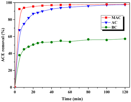 Figure 9 represents the ACE adsorption kinetics at 298 K on BC, AC, and MAC carbon adsorbents. While BC only achieved around 50% of ACE removal, both samples, AC and MAC, reached the complete ACE elimination of the final effluent, probably due to the most developed porous structure of these two materials. It should be underlined that magnetic carbon (MAC) shows faster adsorption kinetics. Anyway, all the samples show a relatively fast adsorption process, reaching the equilibrium after 5 min in the case of the MAC sample, around 10 min for BC, and 30 min for AC. Behavior was also observed for other carbon adsorbents obtained from biomass precursors for ACE adsorption [41]. These results suggest that the carbon adsorbents have a large number of adsorption sites unoccupied, leading to a high driving force for the mass transfer from the bulk solution to the surface of the adsorbent and, consequently, to a fast adsorption process [68,69].