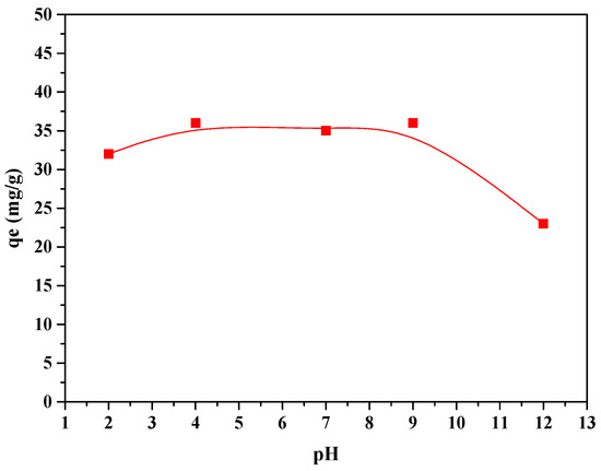 ACE equilibrium adsorption capacities on MAC at different initial pH values (adsorbent mass = 0.2 g·L−1, [ACE]0 = 25 mg·L−1; T = 298 K).