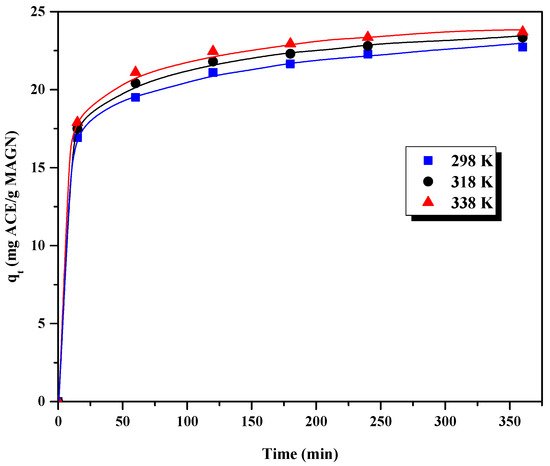 ACE adsorption kinetics on MAC at different temperatures are collected in Figure 12. The adsorption process is very fast regardless of the adsorption temperature in the range studied. The adsorption capacity increases slightly with the temperature, suggesting an adsorption process of endothermic nature.