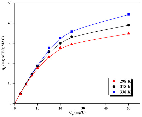 Figure 13 displays the ACE equilibrium adsorption isotherms on MAC at 298, 318, and 338 K. They belong to the L type of Giles classification [77], common in liquid-phase adsorption, and characteristic of strong adsorbate–adsorbent attractive forces and weak interactions between the adsorbate molecules. As can be observed, the amount of ACE adsorbed at equilibrium increased with temperature, in agreement with the kinetic curves (Figure 12) and suggesting an endothermic character of the process. This behavior has been previously reported in the literature for the adsorption of ACE on other biomass-derived activated carbons [78], although other authors have reported just the opposite behavior with other activated carbons [79,80]. These differences could be due to the differences in the adsorbent surface chemistry [78]. The highest adsorption capacity at equilibrium is around 45 mg·g−1. These values agree with others found in the literature for activated carbons prepared from different biomass precursors for ACE adsorption, such as 19.7 mg·g−1 for pyrolyzed pulp mill sludge [81], 20.96 mg·g−1 for rice husk [82] or 45.45 mg·g−1 for oak fruits [83]. In general trend, activated carbons with more developed surface area achieved higher equilibrium adsorption capacities: different activated carbons with surface area values in the range 400−1000 m2·g−1 yielded adsorption capacities of 118.6 mg·g−1 for AC from industrial pre-treated cork [84] or 190 mg·g−1 for activated carbons from sisal waste [85]. This fact suggests that, despite other characteristics of the adsorbent that can affect the adsorption process, the porosity development is among those that most affect the adsorption process.
