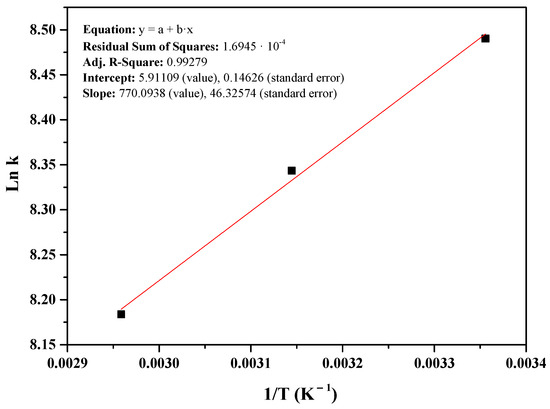 where K was calculated from the KRP values (Table 5) [92], these last obtained from the Redlich–Peterson model that gave rise to the best fitting of the experimental data [15], R is the gas constant (8.314 J·mol−1·K−1) and T the adsorption temperature (K). The free energy values obtained were −21.03, −22.06, and −23.00 kJ·mol−1 at 298, 318, and 338 K, respectively. The negative values indicate the spontaneity of the process [91]. Values of ΔG between 0 and −20 kJ·mol−1 suggest a physical adsorption process [92]; in this case, the ΔG values are near the minimum of this range. This result will be confirmed later by the ΔH value obtained in this work. On the other hand, enthalpy (ΔH0) and entropy (ΔS0) of adsorption were calculated from adsorption data at different temperatures using the van’t Hoff Equation (Equation (13)) as follows: