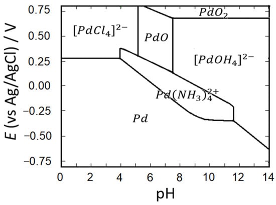 According to the equilibrium constants reported in the literature, the predominant chemical species of Pd(II) in the function of the pH in an aqueous ammoniacal plating bath are [PdCl4]2, [Pd(NH3)2Cl2], and [Pd(NH3)4]2+ [26,28,47]. Here, it is important to mention that in the tramscomplexes Pd(NH3)2X2, the substitution of X by NH3 takes place rapidly, by which the predominant chemical species is [Pd(NH3)4]2+ [24]. Under these premises, we plotted the corresponding Pourbaix’s diagram considering a solution with a composition plating bath of 1 mM of PdCl2, 1 M of NH4Cl, and NaOH, employing the predominance diagram algorithm as implemented in Hydra-Medusa software [48], and the results are depicted in Figure 1.