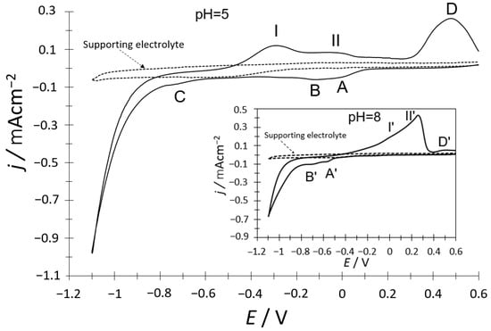 Also, a plot of the cathodic peak potential of peaks A and A’ vs. log v was performed, and it was found that Ep increased linearly with log ν. The equation obtained at pH = 5 is , while at pH = 8, the equation is . Here, it is important to remember that an irreversible diffusion-controlled process can be described by Equation (5) [53,54]