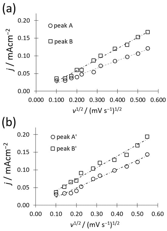 Plot of the experimental cathodic current density peak (jp) as a function of scan rate (ν1/2) for peaks (a) A and B and (b) A′ and B′. The broken line corresponds to the tendency of the experimental data.