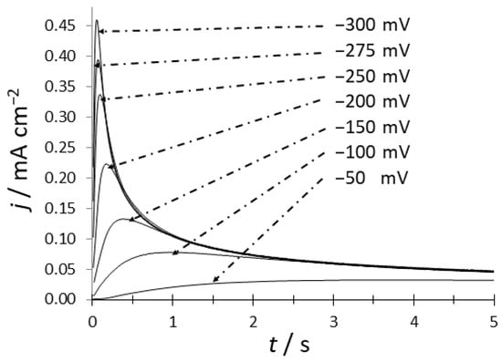 A set of current density transients obtained from the HOPG/10−3 M of PdCl2 and 1 M of NH4Cl system adjusted with NaOH at pH = 8 by the single potential step technique for different potential step values indicated in the figure.