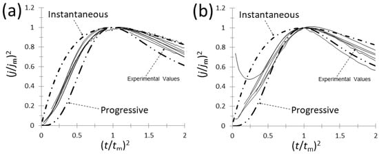 From the transients reported in Figure 4 and Figure 5, it is possible to classify the nucleation as instantaneous or progressive following the Sharifker equations [59]. Thus, the experimental transients of non-dimensional vs. forms are compared with those theoretically generated from the instantaneous and progressive equations, Equations (6) and (7), respectively, see Figure 6. In the case of instantaneous nucleation, it occurs rapidly and simultaneously on the electrode surface, leading to a homogeneous morphology with uniformly growing nuclei, which is beneficial for applications requiring uniform coverage. On the other hand, progressive nucleation involves the continuous formation of new nuclei throughout the process, resulting in a heterogeneous morphology with a wider particle size distribution and increased surface roughness.
