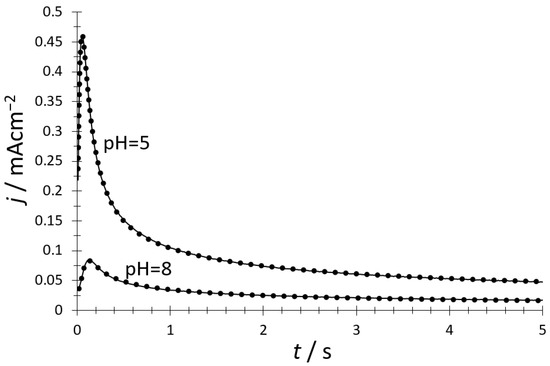 Comparison between an experimental current density transient (−) recorded during Pd electrodeposition onto a HOPG electrode at an applied potential of −0.300 V and the theoretical transient (●) generated by the non-linear fitting of Equation (8) to the experimental data. The figure presents the fitting for transients obtained at pH 5 and pH 8.