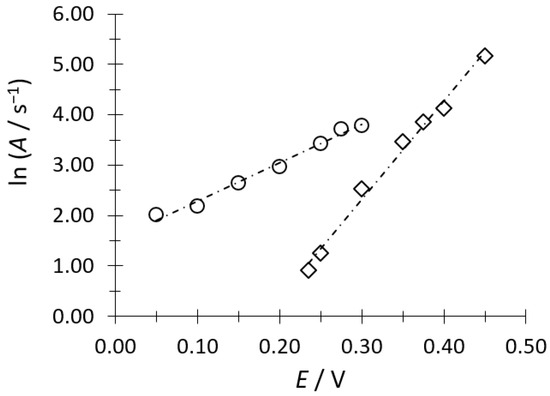ln kPR vs. −E plots used to calculate the transfer coefficient for the proton reduction process at pH 5 (o) and pH 8 (◊). The broken straight line corresponds to a linear regression of the experimental data to Equation (16).
