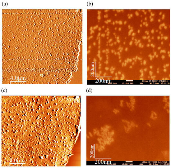 The morphology of the electrodeposits was investigated using Scanning Electron Microscopy (SEM). SEM images were acquired for electrodeposits formed potentiostatically at −0.300 V under both pH 5 (Figure 10a,b) and pH 8 (Figure 10c,d) conditions. If one directly counts the number of nuclei in Figure 10b,d, there are approximately 318 nuclei and 210 nuclei, respectively, in the area shown. From this number, one can calculate the number of nuclei per cm2. For pH = 5, the value is 39.8 × 109 nuclei per cm2, while for pH = 8, the value is 28.7 × 109 nuclei per cm2. Note that these values are in the same order as the number of active nucleation sites reported in Table 1 and Table 2. However, there is a higher number of nuclei at pH 5 in comparison to pH 8. This is probably due to the overlapping of nuclei observed at pH 8, which is less pronounced at pH 5. These results suggest that this phenomenon must be considered to predict more accurate values when the nuclei overlapping is significant. However, from the results, it is clear that the number of nuclei predicted by the nucleation model employed in this work compares favorably with those obtained via SEM studies. Thus, as shown in Figure 10, these SEM images clearly depict the formation of dispersed and small Pd clusters on the HOPG surface. Based on the SEM images acquired for electrodeposits formed at different pH conditions, it is evident that there are significant differences in the sizes of Pd clusters obtained. At pH 5, larger Pd clusters with an average diameter of 27 nm and a height of 39 nm were observed, while at pH 8, Pd agglomerates with Pd clusters with an average diameter of 12.8 nm and a height of 16.6 nm were obtained. The Pd clusters obtained in this study resemble those achieved on HOPG when KCl is used as the supporting electrolyte [15], but they appear smaller when HCl is utilized [62]. Thus, these variations in cluster size suggest a competition for the available nucleation active sites between the proton reduction and the Pd electrodeposition processes. This competition between the proton and palladium processes ultimately influences the size and morphology of the Pd clusters formed on the HOPG surface. Thus, at pH 5, where the proton reduction process is more dominant, dispersed larger Pd clusters tend to form. Conversely, at pH 8, where conditions favor Pd electrodeposition, smaller Pd clusters are favored in agglomerates of different sizes.