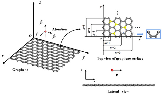 where m is the mass of the atom/ion, γ is the damping factor in three directions, and the lateral forces fx, fy and the normal force fz are the forces acting on the atom/ion by the finite-size graphene. By solving Equations (8)−(13) numerically, the velocity, position, and migration path of an atom/ion as it migrates on the graphene surface can be obtained. In addition, the dynamical behavior of the atom/ion migration on the graphene surface is also influenced by the initial height, initial position, initial velocity of the atom/ion, etc.