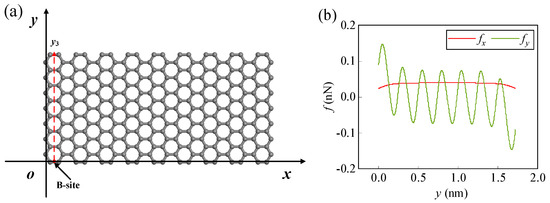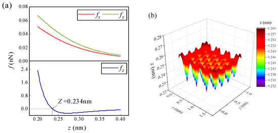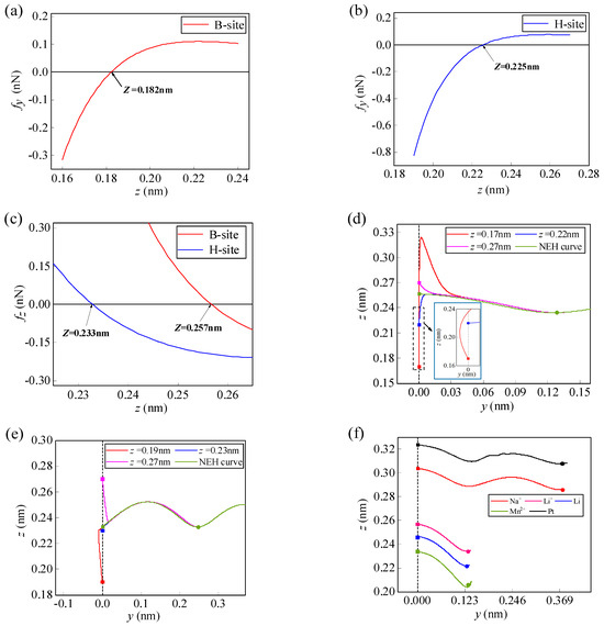 When an atom/ion migrates on the surface of graphene, it will be mainly affected by the lateral forces fx, fy in the Equations (8) and (9) and the normal force fz in Equation (10). Taking lithium-ion (Li-ion) as an example, when it is located somewhere at the edge of graphene, the changes of the forces in three directions with height are shown in Figure 2a. Obviously, the normal force fz is more sensitive to the change in height than the lateral forces fx and fy. Generally, the normal force is greater than the lateral force. Moreover, it can be seen in the figure that there is a height where the normal force of Li-ion is zero on the surface of graphene, and this height is defined as the normal equilibrium height (NEH). The Li-ion has an NEH at each horizontal position on the graphene surface. Therefore, there is an NEH surface on which the normal force acting on Li-ion is zero. Due to the periodicity of graphene, the NEH surface is a periodically changing surface, except for the edge (as shown in Figure 2b). For other atoms/ions, there are similar NEH surfaces on the graphene surface. Within the NEH surface, the lateral forces fx and fy play a dominant role in the migration behavior of atoms/ions on the graphene surface, mainly changing the horizontal positions of the atoms/ions. When atoms/ions are not on the NEH surface, the normal force will play a major role, mainly changing the heights of the atoms/ions. The final migration positions of the atoms/ions will also stop on the NEH surface.