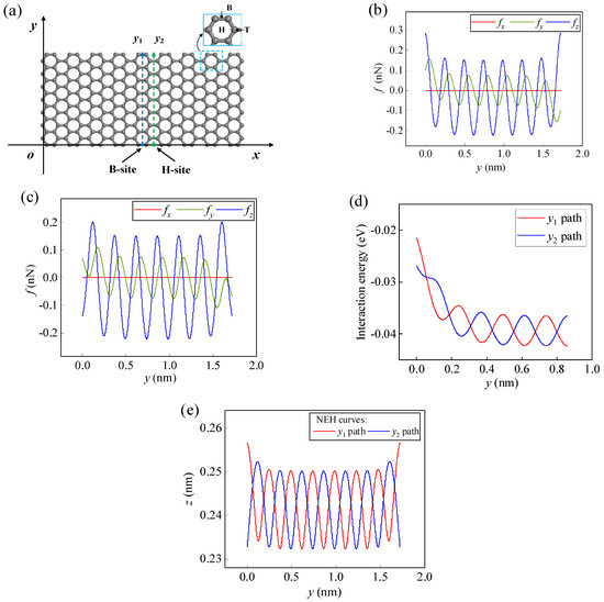 (a) Schematic diagram of the migration paths of a Li-ion on the m = 9 and n = 7 graphene surface. At z = 0.245 nm, the lateral forces fx, fy and the normal force fz of the Li-ion along (b) the y1 path and (c) the y2 path. (d) The interaction energy curves of the Li-ion along the y1 and y2 paths for z = 0.233 nm. (e) NEH curves of the Li-ion on the y1 and y2 paths.