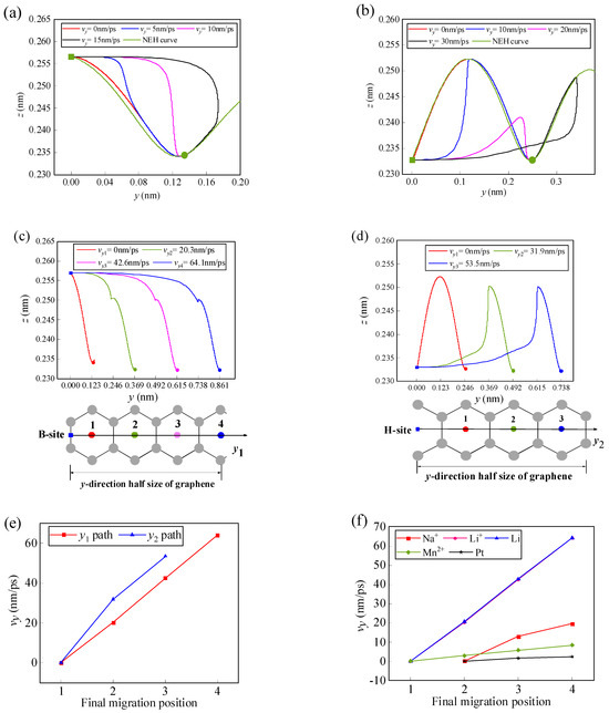 It is assumed that a Li-ion has an initial velocity vy in the y-direction. In the initial position, it is only subjected to the lateral force fy, but once it leaves the initial position, it will be subjected to both the lateral force fy and the normal force fz since it is no longer on the NEH curve. By solving Equations (12) and (13), the path, final position, and critical velocity of the Li-ion can be obtained as it migrates along the y1 and y2 paths on the graphene surface (Figure 5). As can be seen in Figure 5a,b, when the initial velocity of the Li-ion is low, it migrates to the same final position at the H-site of the first carbon ring adjacent to the initial position. The horizontal migration path of the Li-ion to the position can be divided into two modes. First, in the horizontal direction, the Li-ion migrates all the way to the final position; second, the Li-ion crosses the final position and then moves backward and returns to the final position, which is consistent with the migration patterns of the one-dimensional path in the literature [15]. In contrast, the vertical migration behaviors all show a movement from the initial position towards the NEH curve. As the initial velocity of the Li-ion increases, it is possible for it to gain enough energy to cross more energy barriers to reach the H-site of the second or even further carbon ring. The arrival of Li-ion at the H-site of each carbon ring corresponds to a minimum initial lateral velocity, which is defined as the critical initial lateral (CIL) velocity. Figure 5c,d show the CIL velocities and the paths of the Li-ion as it reaches the H-site of several adjacent carbon rings. Based on the energy barrier along the two migration paths (Figure 3d), it can be found that the two adjacent CIL velocities form a velocity interval corresponding to a final migration position. For example, along path y1, when the initial velocity of the Li-ion is between 0 and 20.3 nm/ps, the Li-ion will stop at the first H-site; when the initial velocity is between 20.3 and 42.6 nm/ps, the Li-ion will stop at the second H-site, and so on (Figure 5c). And, as can be seen in Figure 5e, the CIL velocity is approximately linear with the final position as the Li-ion migrates along the y1 and y2 path.