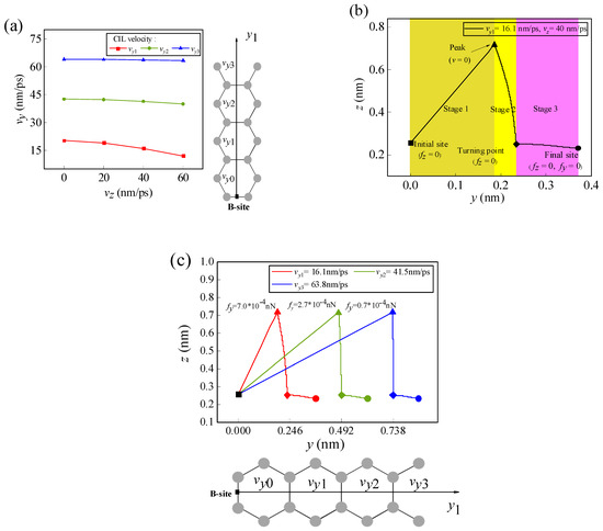 Figure 6b shows the trajectory of the Li-ion as it migrates along the y1 path at the initial normal velocity of 40 nm/ps and the CIL velocity of 16.1 nm/ps. In the figure, it can be seen that the trajectory of the Li-ion is divided into three stages. In the first stage, the Li-ion migrates to the highest point, and the initial normal velocity gradually decreases to 0; in the second stage, the Li-ion falls from the peak to the NEH curve; and in the third stage, the Li-ion migrates to its final position along the NEH curve. In the first stage, the initial normal and lateral velocities of the Li-ion play a dominant role, and the initial normal velocity determines the highest point of the Li-ion trajectory. In the second stage, the normal force plays a leading role, resulting in the Li-ion moving back to the NEH curve. In the third stage, the lateral force plays a dominant role, causing the Li-ion to move to the final stable position. The trajectory of the Li-ion at different CIL velocities when the initial normal velocity is 40 nm/ps is shown in Figure 6c. It can be seen that as the CIL velocity increases, the final position of Li-ion migration moves farther away from the edge, and the lateral offset of the second stage motion trajectory gradually decreases. The analysis of the lateral forces at the highest points reveals that the closer to the edge of the graphene, the higher the lateral force. When the normal velocity is in existence at the highest point of the migration trajectory and since the lateral force near the starting edge is more effective than that inside graphene, the initial lateral velocity required to reach the equilibrium position near the edge becomes smaller. As the final migration position of the Li-ion moves away from the edge, the lateral force at the highest position decreases and has a negligible effect on the initial lateral velocity. This explains the reason why the effect of the initial normal velocity on the CIL velocity has an edge effect.