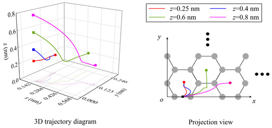 From the previous analysis, it can be seen that the NEH surface is the equilibrium surface of normal force, where the lateral forces play major roles in the spontaneous migration of atoms/ions. Outside the NEH surface, the normal force plays an important role in the migration of atoms/ions. Figure 8 shows the trajectories of the Li-ion and its projections for different initial heights as it migrates along the y3 direction from the B-site on the graphene surface. It is not difficult to find that the initial height has a significant effect on the final equilibrium position of the Li-ion’s spontaneous migration. Near the NEH, the final position of Li-ion migration is at the first H-site, which is consistent with the result of migration along the y1 path in the interior of graphene. However, when the initial height is far away from the NEH, the effect of the normal force is enhanced. Under the combined action of normal force and x- and y-directional lateral forces, the Li-ion will cross the energy barrier of the adjacent carbon ring and migrate to the H-sites of other carbon rings (Figure 8).