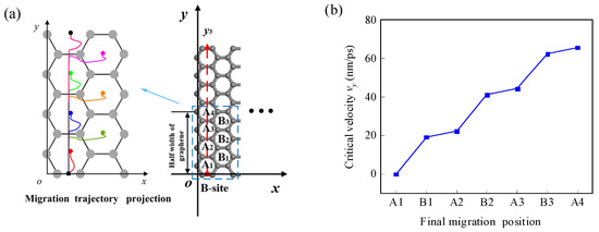In the above section, the spontaneous migration behavior of the Li-ion with an initial velocity of zero has been investigated. In this section, the migration behavior of the Li-ion will be studied when it has a certain initial velocity. The migration paths are still along the y1 and y2 directions (Figure 3a) and the corresponding initial positions are at the B-site and H-site, respectively. The initial heights are the NEHs of the Li-ion at the B-site and H-site. Due to the symmetry of the interaction energy curves of graphene along the y1 and y2 paths, the migration zone is chosen to be half of the graphene size along the migration path direction.