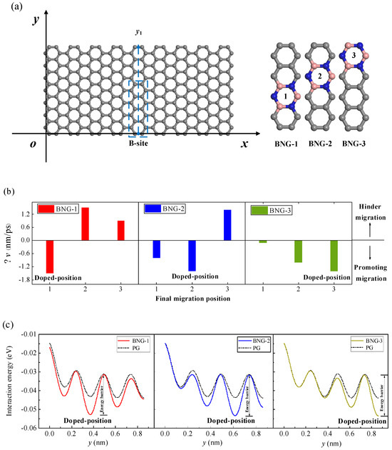 It is assumed that a Li-ion still migrates from the B-site along the y1 path on the surface of the graphene. Along the y1 path direction, the graphene has been partially doped with BN at three different positions (Figure 10a). The changes in the CIL velocities of Li-ions along the y1 path to the three adjacent equilibrium sites are given in Figure 10b. As can be seen in the figure, compared with the pristine graphene, the CIL velocities of Li-ions migrating into the BN-doped positions are smaller, that is, Li-ions are more likely to migrate to the doping site from the undoped graphene site. However, the CIL velocities of the Li-ion crossing the BN-doped positions increase, which means that it is more difficult for the Li-ion to migrate away from the BN-doped site. Figure 10c shows the interaction energy when the initial height of the Li-ion migration is the NEH, and it migrates along the y1 path on the surface of the pristine graphene BNG-1, BNG-2, and BNG-3 structures. It can be seen in the figure that the Li-ion has a lower adsorption energy and more stable adsorption at the BN-doped site. Thus, compared with the pristine graphene, the Li-ion is more likely to reach the BN-doped site and requires a smaller CIL velocity. However, at the next stable adsorption site adjacent to the BN-doped site, although the adsorption energy also decreases compared to the pristine graphene, the required CIL velocity increases due to the higher energy barrier needed to overcome to cross the doping site. Therefore, the CIL velocity of Li-ion migration can be regulated by local doping so as to control its final migration position.
