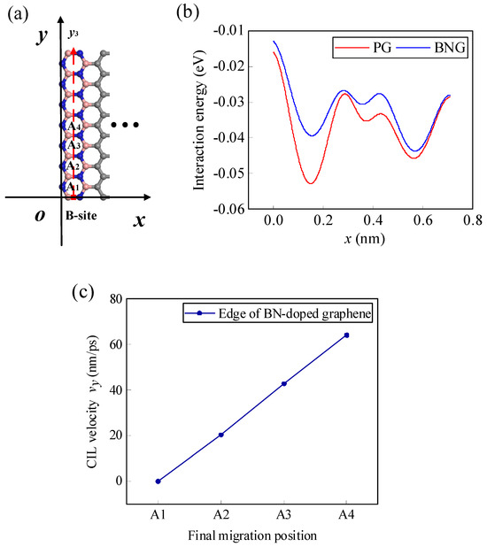 According to the analyses in Section 4, as Li-ions migrate along the y3 path at the edge of the pristine graphene, there is x-directional displacement due to the existence of x-directional lateral force, causing the final migration position to be not all along the expected y3 path, and the relationship between the CIL velocity and the final position is no longer linear. The migration of Li-ions is actually a process in which it crosses one energy barrier after another with the help of the initial kinetic energy and the lateral force. If the energy barrier in the x-direction is increased, it is possible to control the Li-ion from producing displacement in the x-direction. As shown in Figure 11a, the edge of the graphene is doped with BN. As shown in Figure 11b, the energy curve changes significantly before and after doping, and the energy barrier of Li-ion migrating along the x-direction becomes larger after doping, thus limiting the movement of the Li-ion in the x-direction. As a result, the final position of the Li-ion can be restricted to the y3 path (Figure 11a). Moreover, the CIL velocity of Li-ion migration shows a linear relationship with the final migration position again (Figure 11c).