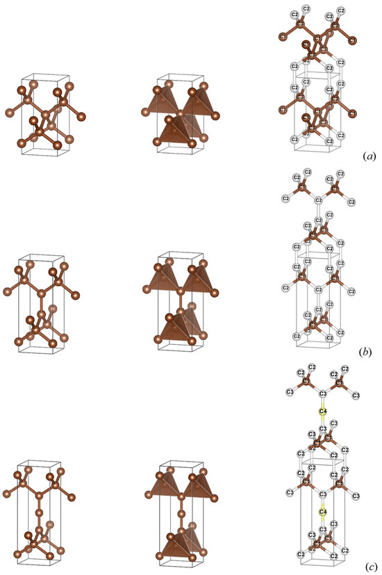 The template tet-C4 (space group I-4m2, No. 119) is characterized by two 2-fold Wyckoff atomic positions for carbon, as shown in Table 1 [5]. The tetragonal body-centered structure in Figure 1a shows the corresponding carbon atoms labeled C1 (brown spheres) at the origin and body center and C2 (white spheres) forming tetrahedra around C1. Considering the structure in the simple tetragonal configuration, the second column of Table 1 explains the four carbon sites. The transformation to C5 retains the tetragonal symmetry, albeit lowered from body-centered (“I” centering) to primitive (“P” centering) and resolved in space group P-4m2, No. 115. This consists of keeping the body-centered carbon (C1 at ½, ½, ½) so that it goes in the C(1c) Wyckoff position—follow the transformation arrows—as well as the two C2s (C2a and C2b), which become C3(2g), where the z coordinate becomes ±z′ instead of ±¼. The additional carbon C2 is provided by parameterizing the z position of C1b, resulting in a two-fold C2 (2e) at 0, 0, ±z. After full geometry relaxation, the resulting structure is shown in Figure 1b, with colored spheres corresponding to the three carbon sites given with the coordinates in Table 1, i.e., with well-determined z = ±0.854 and z′ = ±0.314. The topology of tet-C5 is found to be 3,4^2T1-CA, documented in the SACADA database, while the template tet-C4 has a dia topology. Now, the cohesive energy per atom, Ecoh/atom = −2.06 eV, is lower than that of tet-C4, which is characterized by a large cohesive energy, Ecoh/atom = −2.49 eV (the same as in diamond).