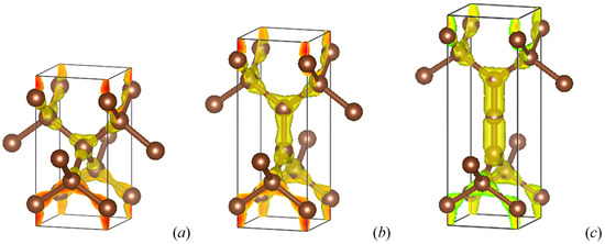 The structural investigations using structure prediction programs [1,2,3] or requiring crystal engineering, as here, need quantitative support from quantum mechanical calculations. Such investigations are mostly carried out within the framework of DFT [11,12], which is widely accepted by the scientific community. Briefly, the DFT was developed in two works: for the theoretical framework, by Hohenberg and Kohn in 1964 [11]; this was followed by Kohn and Sham in 1965 [12], who established the Kohn–Sham equations for solving the wave equation practically within computational codes built around the DFT. The Vienna Ab initio Simulation Package (VASP) code [13,14] and the Projector Augmented Wave (PAW) method [14,15] for the atomic potentials were used for the identification of the ground-state structures corresponding to the energy minima and the subsequent prediction of their mechanical and dynamical properties. DFT exchange-correlation (XC) effects were considered using the generalized gradient approximation (GGA) [16]. Relaxation of the atoms to the ground-state structures was performed with the conjugate gradient algorithm according to Press et al. [17]. The Blöchl tetrahedron method [18] with corrections according to the Methfessel and Paxton scheme [19] was used for geometry optimization and energy calculations, respectively. Brillouin zone (BZ) integrals were approximated by a special k-point sampling according to Monkhorst and Pack [20]. Structural parameters were optimized until atomic forces were below 0.02 eV/Å and all stress components were <0.003 eV/Å3. The calculations were converged at an energy cutoff of 400 eV for the plane-wave basis set in terms of the k-point integration in the reciprocal space from kx(6) × ky(6) × kz(6) up to kx(12) × ky(12) × kz(12) to obtain a final convergence and relaxation to zero strains for the original stoichiometries presented in this work. In the post-processing of the ground-state electronic structures, the charge density projections were operated on the lattice sites.