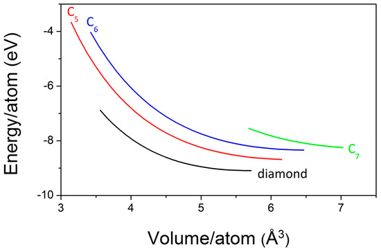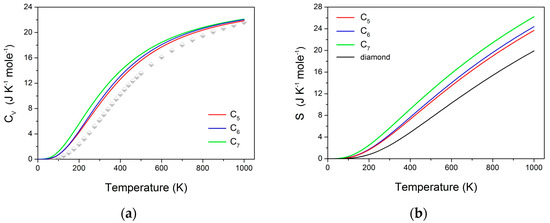 The thermodynamic properties of novel carbon allotropes were calculated from the phonon frequencies using the statistical thermodynamic approach [37] on a high-precision sampling mesh in the Brillouin zone. The temperature dependencies of the heat capacity at constant volume (Cv) and entropy (S) are shown in Figure 7 in comparison with available experimental Cp data for diamond [38,39]. For all three allotropes, the heat capacity and entropy are higher than those of diamond and increase in the C5–C6–C7 series, which is to be expected due to the increasing openness of the crystal structures compared to diamond, on the one hand, and the respective conducting versus insulator electronic properties, on the other hand.
