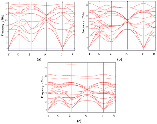 To verify the dynamic stability of the novel carbon allotropes, their phonon properties were studied. The phonon band structures obtained from a high resolution of the tetragonal Brillouin zone according to Togo et al. [28] are shown in Figure 6. The bands (red lines) develop along the main directions of the tetragonal Brillouin zone (horizontal x-axis), separated by vertical lines for better visualization, and the vertical direction (y-axis) shows the frequencies ω, given in terahertz (THz).