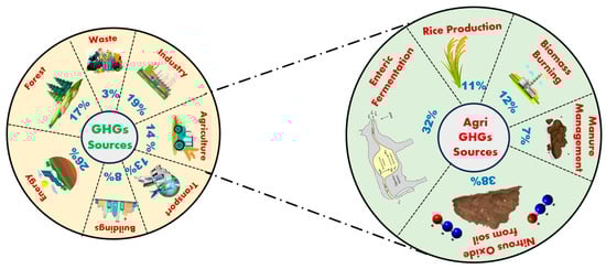In the light of a changing climate and a growing population, ensuring food security is a topic of global discussion. The global population is projected to reach nine billion by the end of 2050, and therefore increasing agricultural productivity is the need of the hour. In the face of more pressing environmental issues, the need to address climate change has sparked a search for novel ways to mitigate its consequences []. Climate-smart agriculture is one such method of increasing production sustainably. It also aims to lessen agriculture’s contribution to climate change through reducing greenhouse gas (GHG) emissions and increasing carbon sequestration []. Increased emissions of GHGs from different sources (Figure 1) are one of the main causes of global warming. The increase in atmospheric carbon dioxide (CO2), from 280 ppm in the pre-industrial period to 310 ppm in 2010 (39% enrichment), as well as other GHGs like nitrous oxide and methane, has changed the mean precipitation and temperature []. It has been said that CO2 concentrations by the year 2100 must be limited to below 441 ppm through the sequestration of carbon in soils and other inland aquatic and terrestrial ecosystems []. The act of capturing atmospheric CO2 by plants via photosynthesis and storing it as carbon in soil and biomass is known as carbon sequestration []. This helps to reverse soil fertility loss, limit atmospheric GHG concentration, and also decrease the climate change impact on agricultural ecosystems [].
