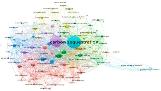 We performed a bibliometric analysis using data sourced from Scopus and executed a network visualization through the VOS viewer. We retrieved approximately 43 documents from the Scopus database using the keywords “carbon AND sequestration AND horticulture AND crops”. We conducted a co-occurrence analysis, using all key words as the unit of analysis. We chose two as the minimum number of key word occurrences. Out of 580 keywords, 107 met the threshold. All 107 keywords have substantial connectivity (Figure 2). These terms exhibit significant interconnectedness, indicating a closely linked multidisciplinary approach to understanding and improving carbon sequestration in horticulture systems. This integrated network symbolizes a cohesive research community committed to common goals and the advancement of knowledge in this crucial area of environmental science. We also conducted a citation analysis, using the authors as the unit of analysis. We chose twenty-five as the maximum number of authors per document. We set a minimum of one document and citation for each author. Out of 221 authors, only 194 authors met the threshold. Figure 3 represents the largest set of connections among the 28 authors.