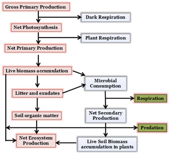 A soil system is a complex and dynamic ecosystem that sustains vital biological functions and facilitates the cycling of important nutrients required for life on land []. Soils play a crucial role in regulating climate by acting as substantial carbon sinks, effectively absorbing and storing atmospheric CO2 [,]. The quantity of organic carbon sequestered in soils is around 1550 Gt, representing approximately 73% of the estimated 2110 Gt of organic carbon present in the biosphere []. Soil organic carbon (SOC) is a crucial element of land-based ecosystems, with a significant impact on soil fertility, structure, and overall ecosystem health. It serves as a reservoir for carbon within the Earth’s carbon cycle and is vital in preventing climate change. About 70% of the carbon on land is found in SOC, which is more than twice as much as the 760 Gt of carbon in the atmosphere []. Together, the management (carbon input) and environmental changes (climatic condition, soil qualities) affect the SOC pool to control the SOC dynamics across time and place [,]. Ecosystem functions heavily depend on the dynamics of SOC, which include its deposition, turnover, and accumulation []. Precipitation and temperature are the primary influential elements that determine the dynamics of soil carbon and contribute significantly to the release of CO2 into the atmosphere during global warming. The climatic conditions and environment of a specific location determine the properties of litters and crop residues []. The quantity and quality (proximate and ultimate constituents) of litter and crop residues directly influence the carbon balance in the soil. Moreover, the quality and quantity of leftovers play a crucial role in shaping the microbial community structure at that specific location. This occurs because microbes utilize this litter as a source of nourishment, thus affecting the distribution of soil organic carbon throughout the area []. Soil conditions, such as geochemistry and physical structure, directly affect the stability of SOC through physico-chemical barriers. SOCs can prevent the breakdown of soil aggregates by occulting them or adsorbing to mineral surfaces. The protective efficacy of different soils varies considerably based on their soil type and physico-chemical conditions. The microbial activities involved in decomposition are influenced by the physical and chemical traits of the soil. Microbial decomposition processes would differ greatly between soils even with equal climate and C inputs due to differing enzyme activity and community structure. Hence, the following strategies have been followed including manuring and fertilizing, management of crop residue, conventional tillage, farmyard manure application, cover cropping, rotational grazing, and perennial cropping systems to enhance the capture of carbon and its storage in soil [].
