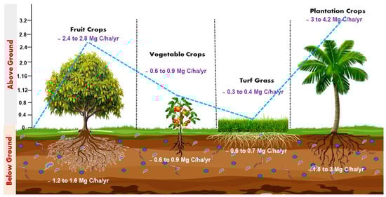 (ii) Root Structure: Compared to annual crops, the root systems of horticultural plants are often more widespread and penetrating. These deeper roots can store carbon deeper in the soil, reducing its vulnerability to rapid decomposition [].